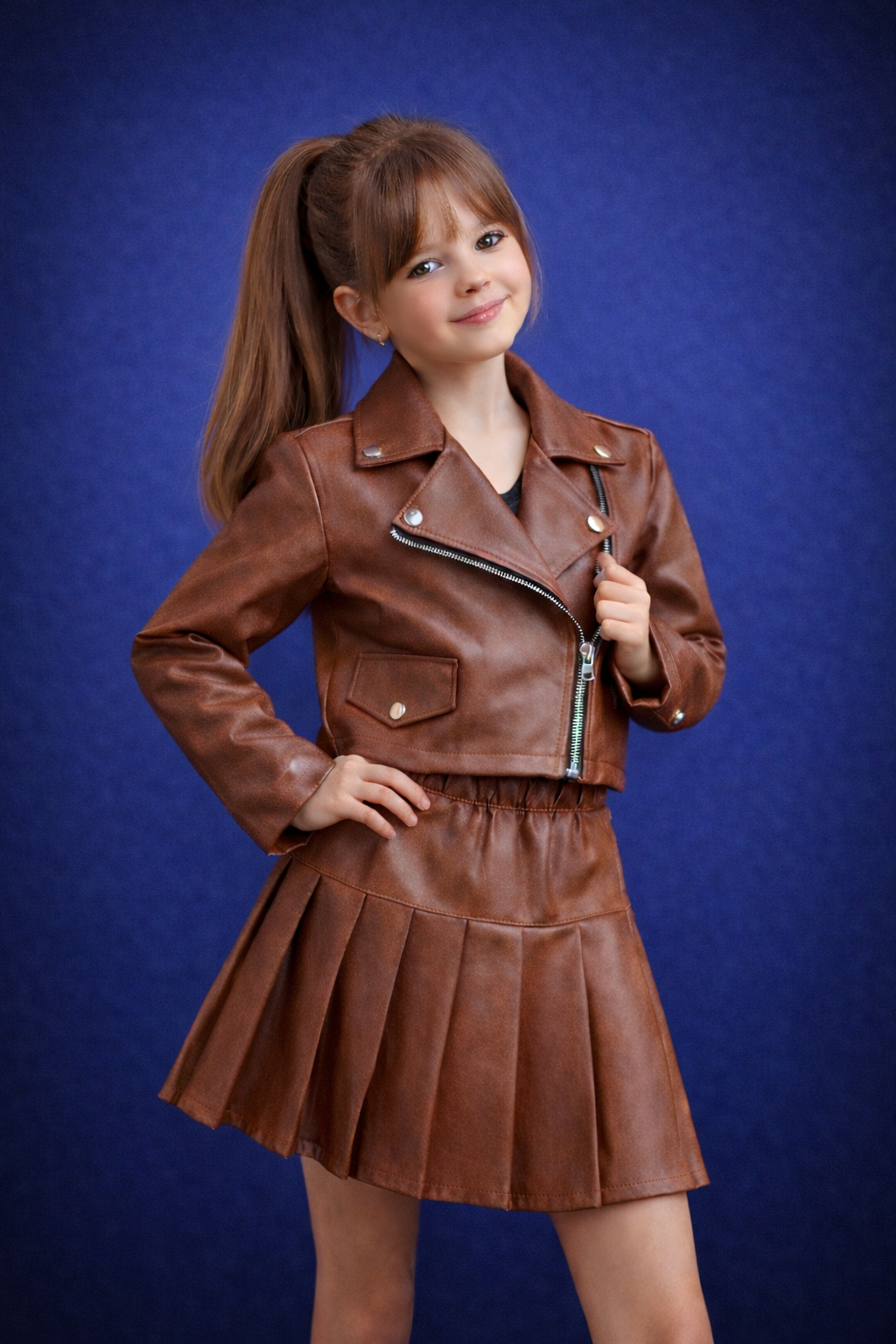 فرم لباس کاملاً متناسب با اندام کودک طراحی شده تا علاوه بر زیبایی، راحتی در حرکت را نیز فراهم کند. دامن با برش منظم و ایستایی مناسب، جلوهای مرتب و جذاب به استایل میدهد.